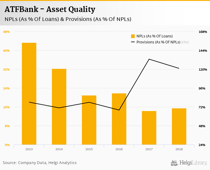 ATFBank's non-performing loans reached 15.5% of total loans at the end of 2018, up from 14.4% compared to the previous year. Historically, the NPL ratio hit an all time high of 43.3% in 2013 and an all time low of 14.4% in 2017.