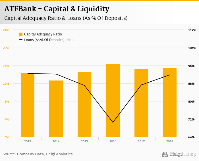 ATFBank's capital adequacy ratio reached 15.4% at the end of 2018, up from 15.3% compared to the previous year. Historically, the bank’s capital ratio hit an all time high of 16.4% in 2016 and an all time low of 12.7% in 2014.