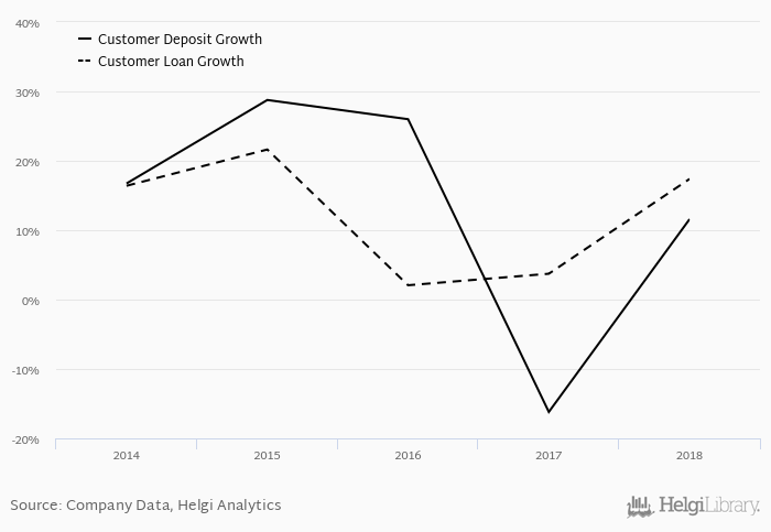 On the other hand, bank's customer deposit growth amounted to 11.6% at the end of 2018, up from -16.2% when compared to the previous year. Historically, the bank’s deposit growth reached an all time high of 28.8% in 2015 and an all time low of -16.2% in 2017. In the last decade, the average annual loan growth amounted to 0%.