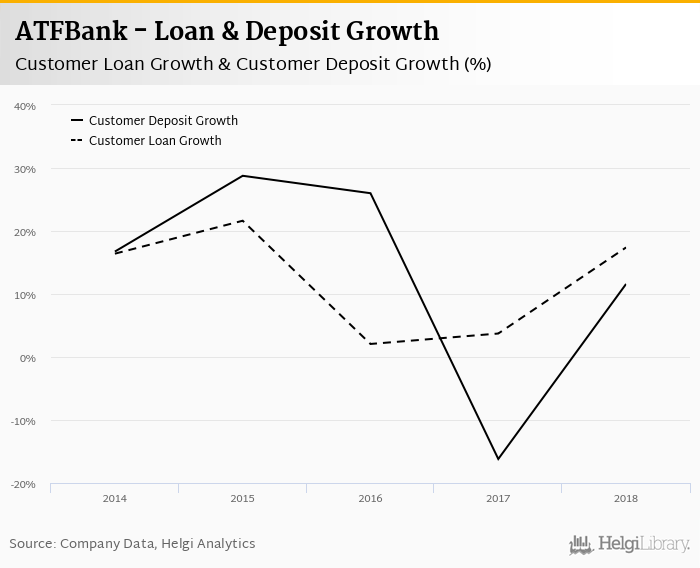 ATFBank's customer loan growth reached 17.4% in 2018, up from 3.73% compared to the previous year. Historically, the bank’s loans growth reached an all time high of 21.6% in 2015 and an all time low of 2.07% in 2016. In the last decade, the average annual loan growth amounted to 0%.