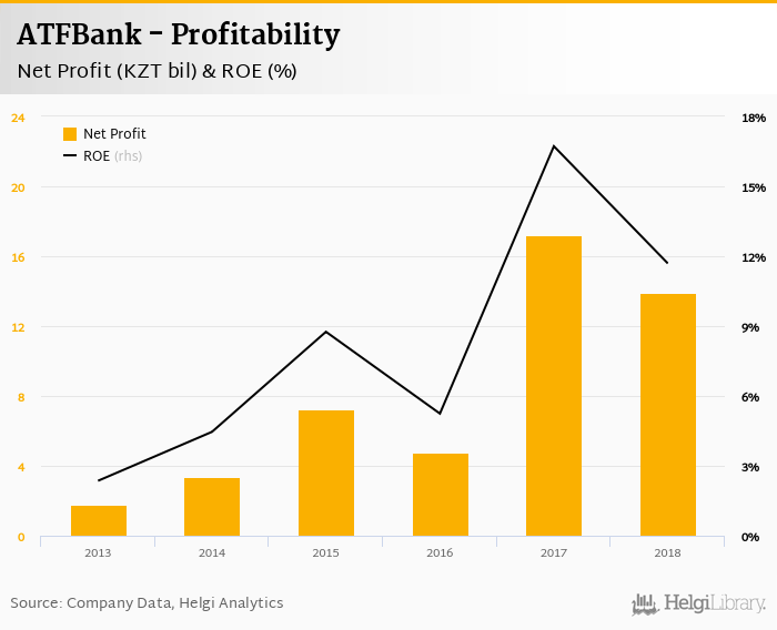 ATFBank made a net profit of KZT 13.9 bil in 2018, down 19.0% compared to the previous year. This implies a return on equity of 11.7%.