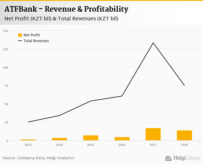 ATFBank made a net profit of KZT 13.9 bil under revenues of KZT 74.9 bil in 2018, up -19.0% and -43.8% respectively compared to the previous year.