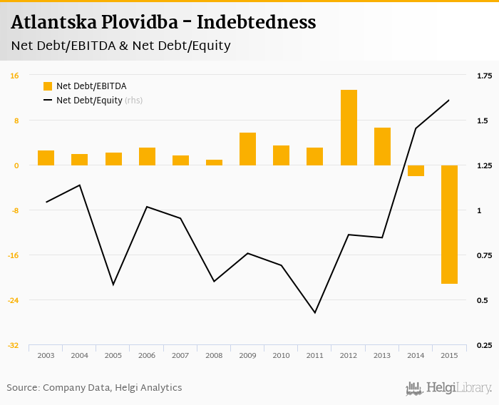 Atlantska Plovidba's net debt stood at HRK 1,063 mil and accounted for 1.61 of equity at the end of 2015. The ratio is up 0.159 pp compared to the previous year.