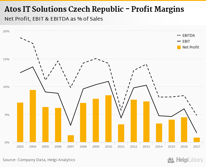 Atos IT Solutions Czech Republic made a net profit of CZK 11.1 mil with revenues of CZK 1,297 mil in 2017, down by 81.5% and down by 2.53%, respectively, compared to the previous year.