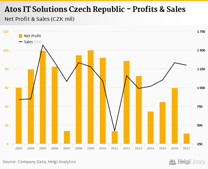 Atos IT Solutions Czech Republic made a net profit of CZK 11.1 mil in 2017, down 81.5% compared to the previous year. Total sales reached CZK 1,297 mil, which is down 2.53% when compared to the previous year.