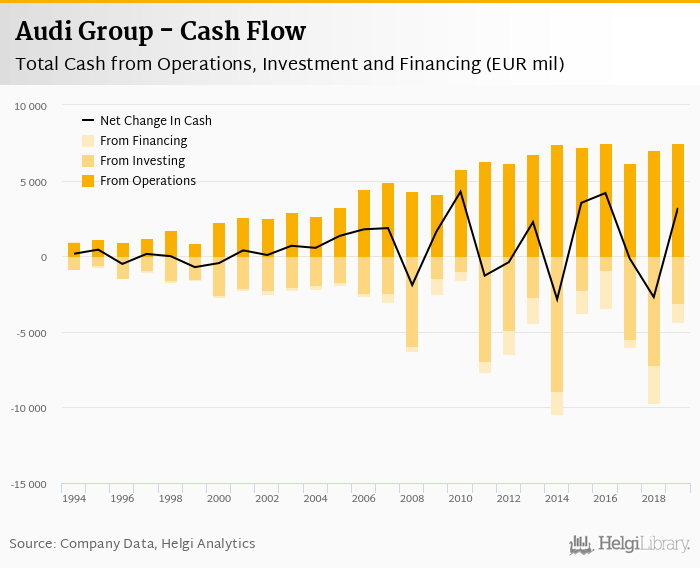 Audi Group's operating cash flow stood at EUR 7,479 mil in 2019, up 6.66% when compared to the previous year. Historically, between 1994 - 2019, the firm’s operating cash flow reached a high of EUR 7,517 mil in 2016 and a low of EUR 870 mil in 1999.