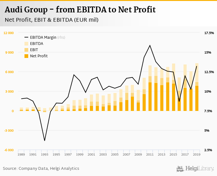 Audi Group made a net profit of EUR 3,850 mil with revenues of EUR 55,680 mil in 2019, up by 13.8% and down by 6.02%, respectively, compared to the previous year. This translates into a net margin of 6.91%.