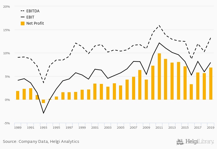 This translates into a net margin of 6.91%. Historically, between 1989 and 2019, the firm’s net margin reached a high of 9.95% in 2011 and a low of -0.709% in 1993. The average net margin in the last five years amounted to 5.81%.