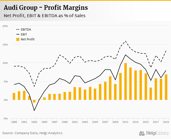 Audi Group made a net profit of EUR 3,850 mil with revenues of EUR 55,680 mil in 2019, up by 13.8% and down by 6.02%, respectively, compared to the previous year.