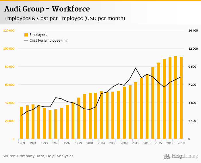 Audi Group employed 90,783 employees in 2019, down 0.759% compared to the previous year. Historically, between 1989 and 2019, the firm's workforce hit a high of 91,477 employees in 2018 and a low of 32,043 employees in 1994.