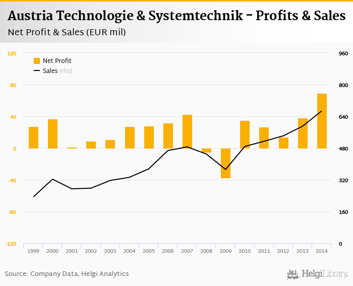 Austria Technologie & Systemtechnik made a net profit of EUR 69.3 mil in 2014, up 81.5% compared to the previous year. Total sales reached EUR 667 mil, which is up 13.1% when compared to the previous year.