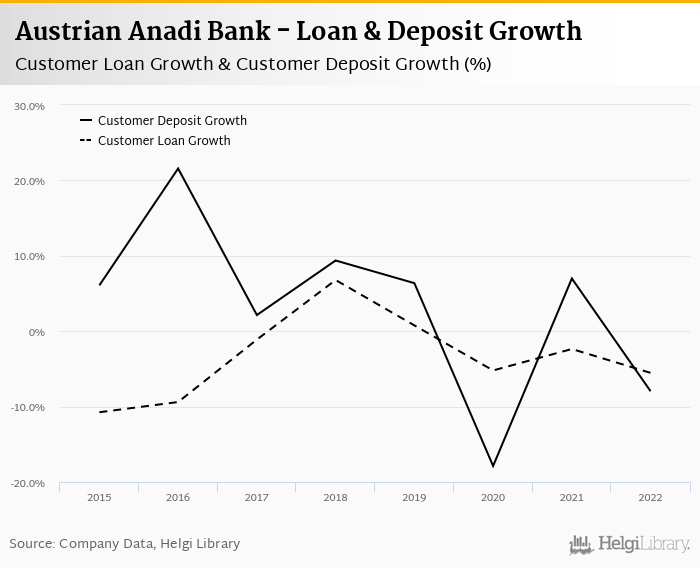Austrian Anadi Bank's customer loan growth reached -5.53% in 2022, down from -2.36% compared to the previous year. Historically, the bank’s loans growth reached an all time high of 6.79% in 2018 and an all time low of -10.7% in 2015. In the last decade, the average annual loan growth amounted to 0%.