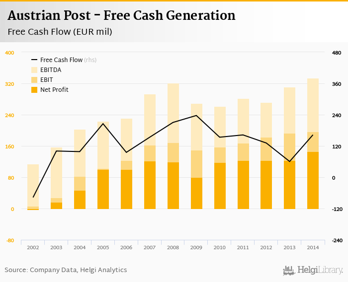 Austrian Post made a net profit of EUR 147 mil with revenues of EUR 2,371 mil in 2014, up by 18.9% and up by 0.156%, respectively, compared to the previous year. This translates into a net margin of 6.18%.