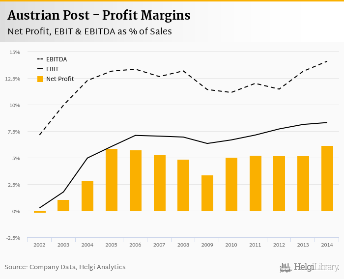 Austrian Post made a net profit of EUR 147 mil with revenues of EUR 2,371 mil in 2014, up by 18.9% and up by 0.156%, respectively, compared to the previous year.