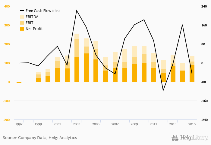 The company generated cash, defined by a sum of net profit and depreciation, of CZK 123 mil or 4.04% of sales. When investments are excluded, free cash flow reached CZK -47.0 mil, or -1.55% of sales in 2015.