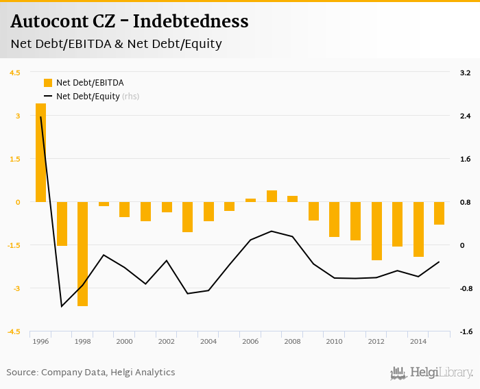 Autocont CZ's net debt stood at CZK -108 mil and accounted for -0.318 of equity at the end of 2015. The ratio is up 0.278 pp compared to the previous year.