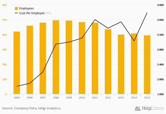 Staff cost represented of sales in 2015, 0 pp higher than a decade ago.