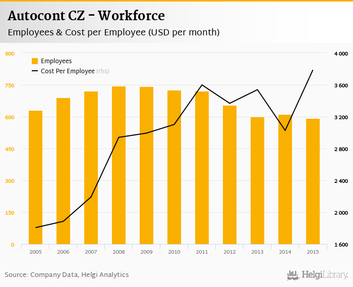 Autocont CZ employed 594 employees in 2015, down 2.78% compared to the previous year. Historically, between 2003 and 2015, the firm's workforce hit a high of 746 employees in 2008 and a low of 0 employees in 2003.