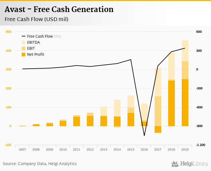 Avast made a net profit of USD 249 mil with revenues of USD 871 mil in 2019, up by 3.11% and up by 7.77%, respectively, compared to the previous year. This translates into a net margin of 28.6%.