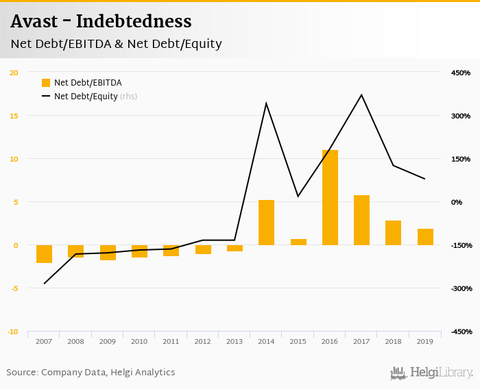 Avast's net debt stood at USD 875 mil and accounted for 77.8% of equity at the end of 2019. The ratio is down 46.8 pp compared to the previous year.