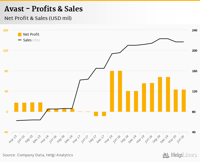 Avast made a net profit of USD 43.3 mil in 2Q2020, down 23.6% compared to the previous year. Total sales reached USD 217 mil, which is up 1.25% when compared to the previous year.