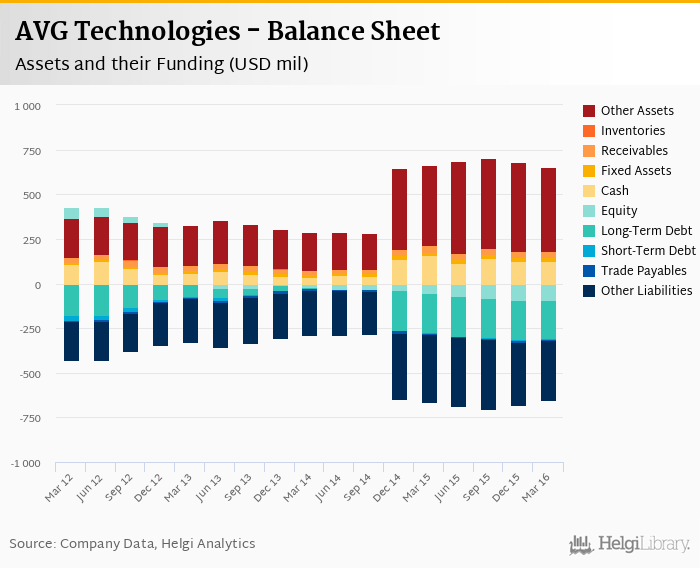 AVG Technologies's total assets reached USD 655 mil at the end of 1Q2016, down 1.19% compared to the previous year.
