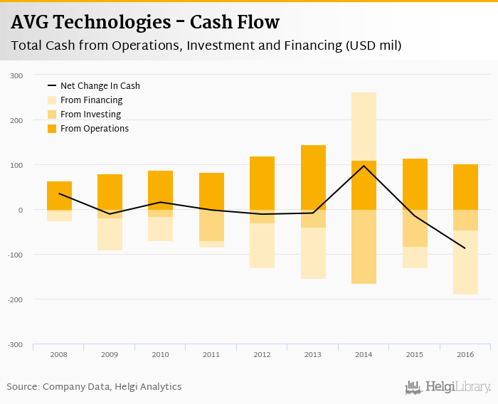 AVG Technologies's operating cash flow stood at USD 101 mil in 2016, down 12% when compared to the previous year. Historically, between 2008 - 2016, the firm’s operating cash flow reached a high of USD 145 mil in 2013 and a low of USD 64.3 mil in 2008.