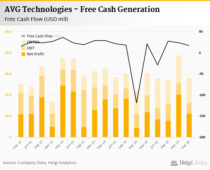 AVG Technologies made a net profit of USD 11.2 mil with revenues of USD 108 mil in 1Q2016, down by 5.64% and up by 4.92%, respectively, compared to the previous year. This translates into a net margin of 11.1%.