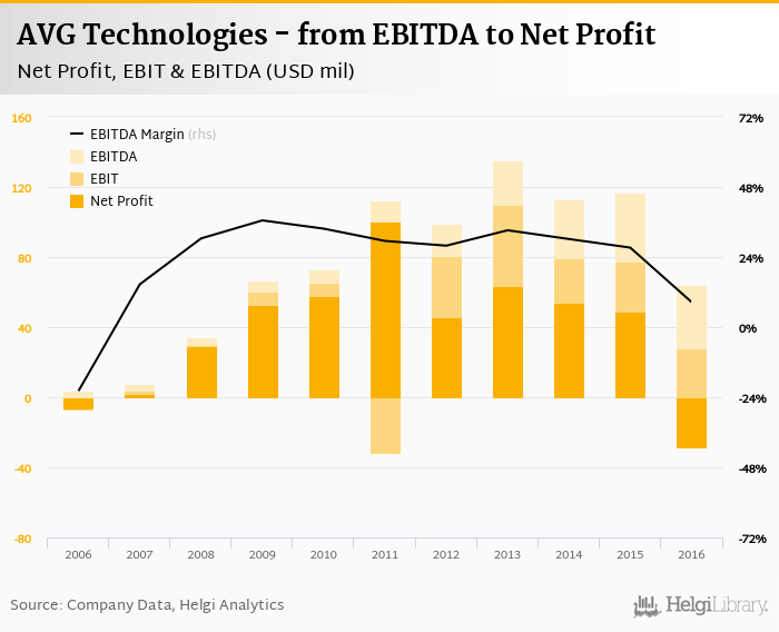 AVG Technologies made a net profit of USD -28.4 mil with revenues of USD 419 mil in 2016, down by 158% and down by 2.27%, respectively, compared to the previous year. This translates into a net margin of -6.78%.