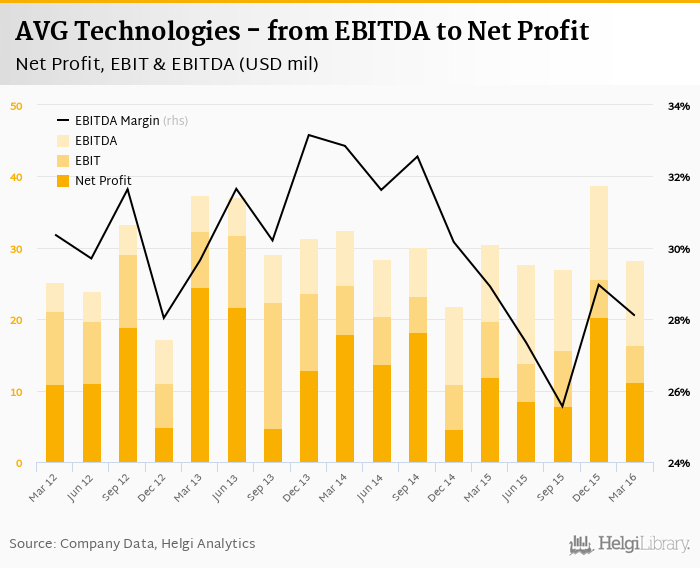 AVG Technologies made a net profit of USD 11.2 mil with revenues of USD 108 mil in 1Q2016, down by 44.5% and down by 1.51%, respectively, compared to the previous year. This translates into a net margin of 11.1%.