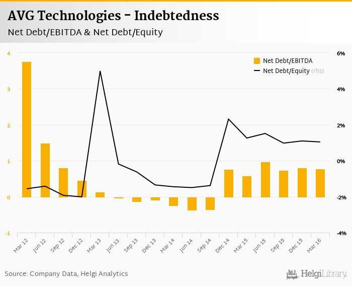 AVG Technologies's net debt stood at USD 95.4 mil and accounted for 1.05% of equity at the end of 1Q2016. The ratio is down 0.217 pp compared to the previous year.