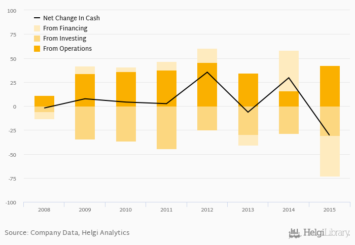 Cash from financing amounted to USD -42.3 mil, so the company generated USD -30.5 mil net cash in 2015.