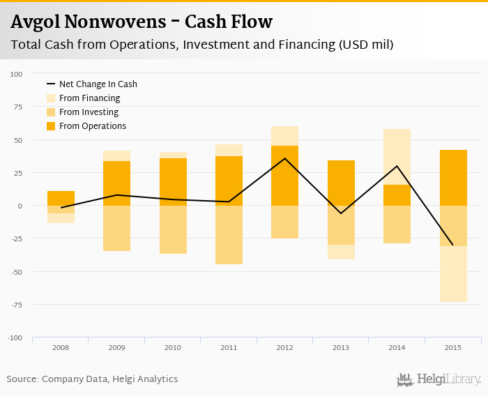 Avgol Nonwovens's operating cash flow stood at USD 42.3 mil in 2015, up 170% when compared to the previous year. Historically, between 2008 - 2015, the firm’s operating cash flow reached a high of USD 45.5 mil in 2012 and a low of USD 11.3 mil in 2008.