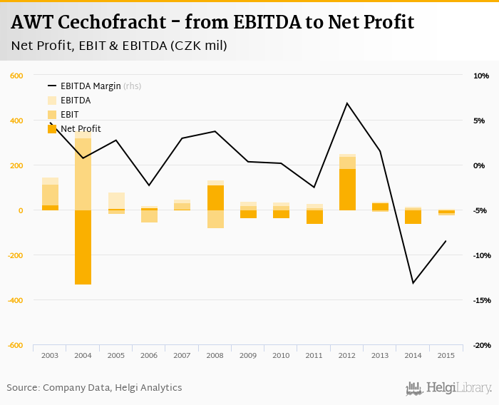 AWT Cechofracht made a net profit of CZK -12.0 mil with revenues of CZK 194 mil in 2015, up by 79.6% and down by 40%, respectively, compared to the previous year. This translates into a net margin of -6.19%.