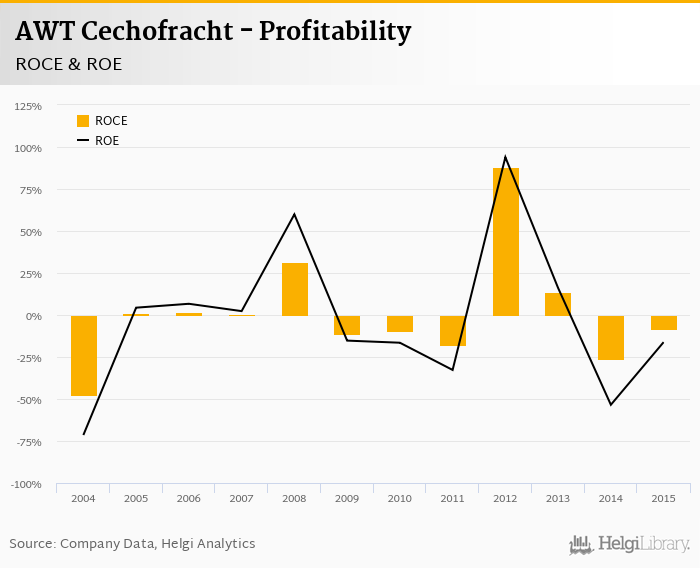 As far as AWT Cechofracht's peers are concerned, Advanced World Transport generated ROE of -5.93% and ROCE of -5.01% in 2015. CD Cargo's profitability reached 1.96% and 1.27%, respectively. CS Cargo operated with 1.48% and 0.158% returns in 2015.