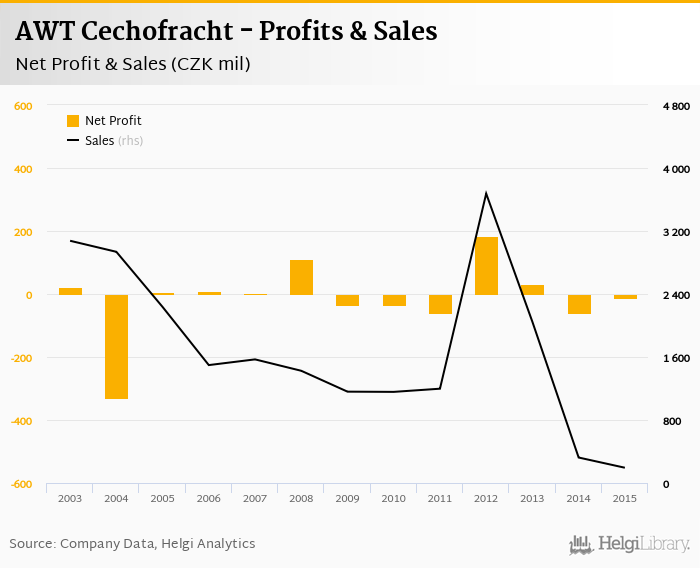 AWT Cechofracht made a net profit of CZK -12.0 mil in 2015, up 79.6% compared to the previous year. Total sales reached CZK 194 mil, which is down 40% when compared to the previous year.