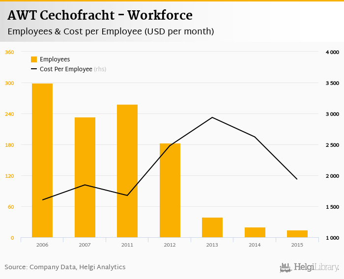 AWT Cechofracht employed 14.0 employees in 2015, down 30% compared to the previous year. Historically, between 2006 and 2015, the firm's workforce hit a high of 299 employees in 2006 and a low of 0 employees in 2008.