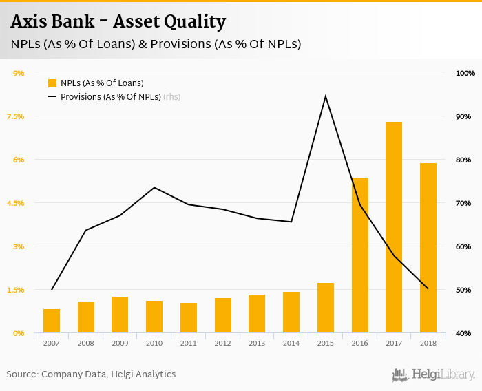 Axis Bank's non-performing loans reached 5.88% of total loans at the end of 2018, down from 7.30% compared to the previous year. Historically, the NPL ratio hit an all time high of 7.30% in 2017 and an all time low of 0.829% in 2007.