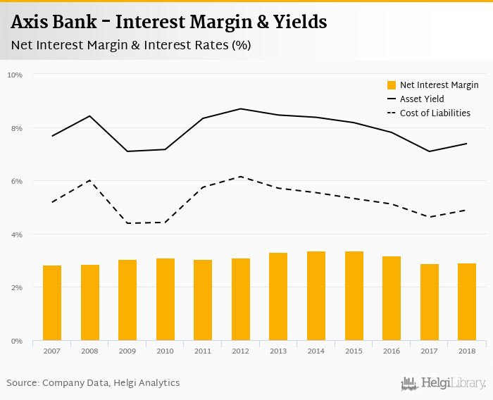 Axis Bank's net interest margin amounted to 2.92% in 2018, up from 2.89% compared to the previous year.
