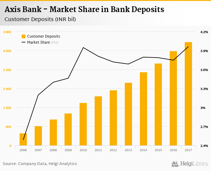 Axis Bank accounted for 3.96% of all customer deposits taken by banks in India at the end of 2017. Historically, the bank’s market share in customer deposits reached an all time high of 3.96% in 2017 and an all time low of 2.49% in 2006.