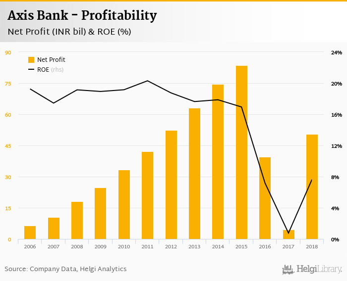 Axis Bank made a net profit of INR 50.4 bil in 2018, up 1,005% compared to the previous year. This implies a return on equity of 7.62%.