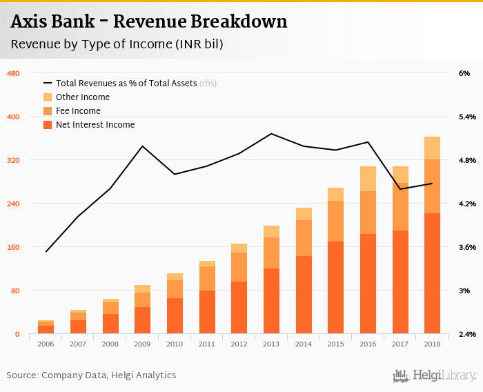 Axis Bank generated total banking revenues of INR 364 bil in 2018, up 17.8% compared to the previous year.