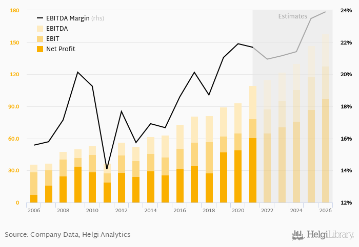 On the operating level, EBITDA reached USD 110 mil, up 17.5% compared to the previous year. Over the last five years, company's EBITDA has risen 8.40% a year on average.