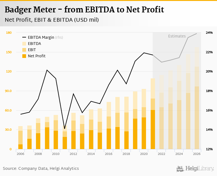 Badger Meter made a net profit of USD 60.9 mil with revenues of USD 505 mil in 2021, up by 23.4% and up by 18.7%, respectively, compared to the previous year. This translates into a net margin of 12.1%.