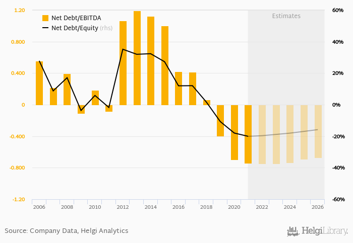 Historically, the firm’s net debt to equity reached a high of 35.1% in 2012 and a low of -20.1% in 2021 between 2006 and 2021. The average for the last five years was -7.04%.