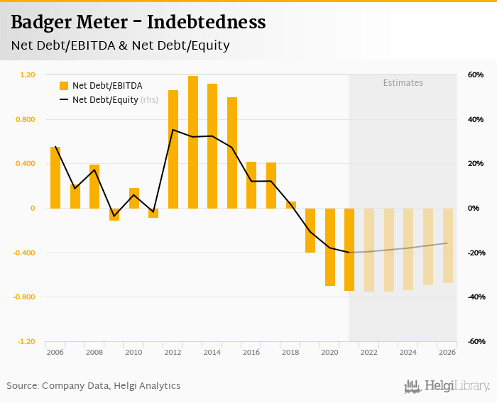 Badger Meter's net debt stood at USD -81.0 mil and accounted for -20.1% of equity at the end of 2021. The ratio is down 2.09 pp compared to the previous year.