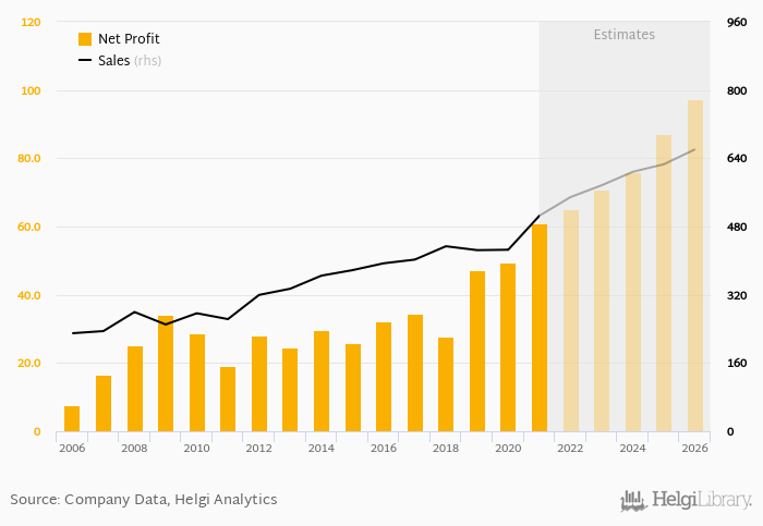 Historically, between 2006 and 2021, the company’s net profit reached a high of USD 60.9 mil in 2021 and a low of USD 7.55 mil in 2006. Over the last decade the firm's net profit increased by an average of 12.3% a year.