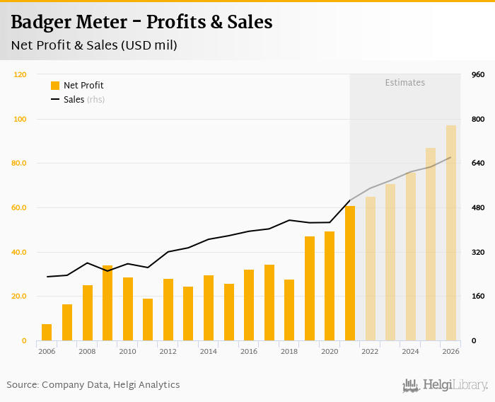 Badger Meter made a net profit of USD 60.9 mil in 2021, up 23.4% compared to the previous year. Total sales reached USD 505 mil, which is up 18.7% when compared to the previous year.