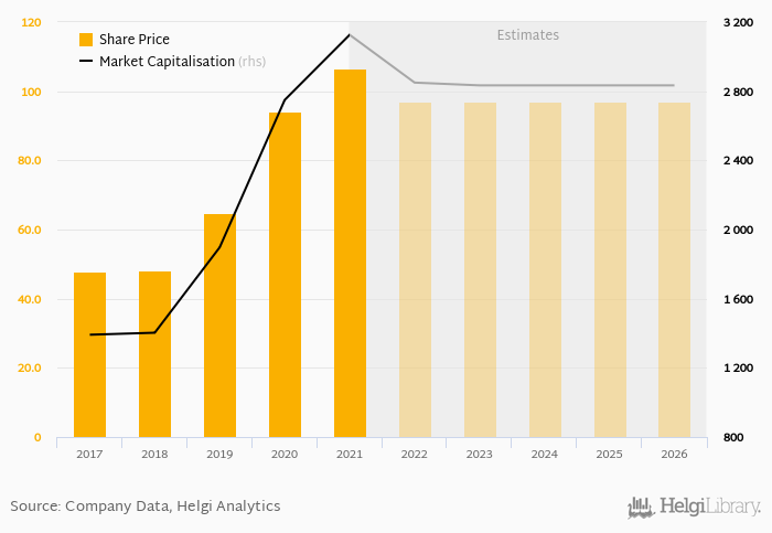 Since the end of 2016, stock has appreciated by % implying an annual average growth of % In absolute terms, the value of the company rose by USD 3,126 mil.