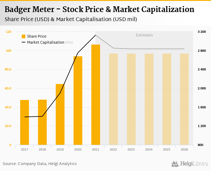 Badger Meter stock traded at USD 107 per share at the end 2021 implying a market capitalization of USD 3,126 mil.